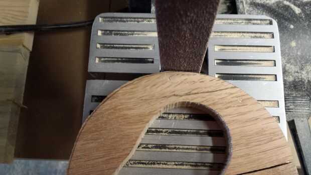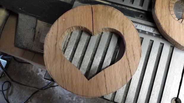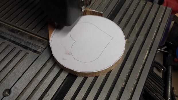Una vez hecho esto, asumir a la lijadora de banda y limpiar el círculo y el interior del corazón. Arena hacia abajo a la línea para hacer agradables curvas suaves. Una vez lisa, utilícela como una plantilla y trazar 3 más en el tablero. Siga los mismo pasos para completar los otros tres corazones.