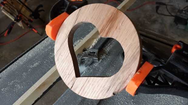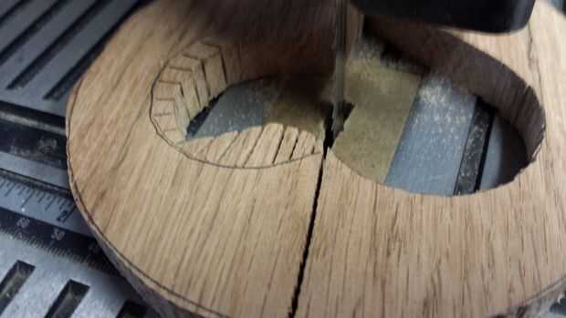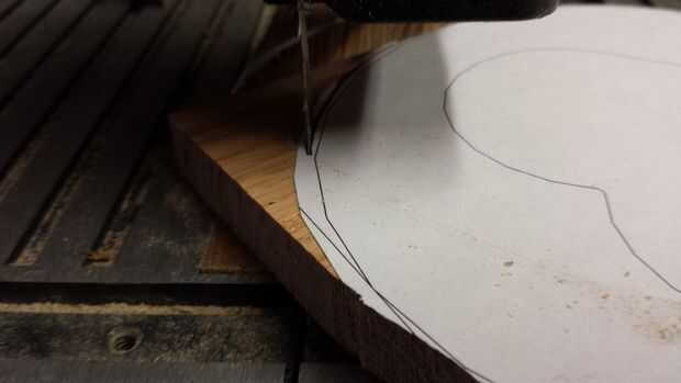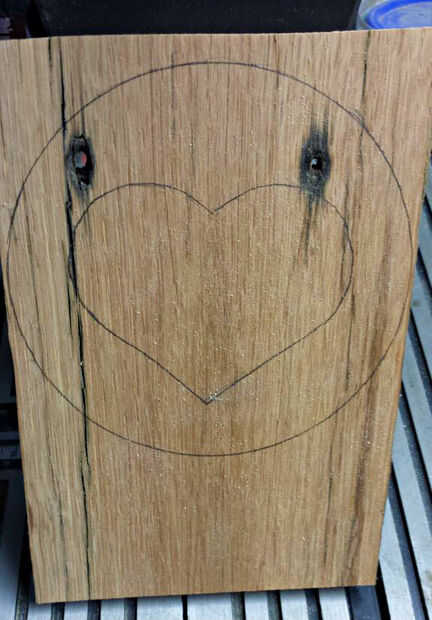 Usando la plantilla había proporcionada (próximamente), imprimir al 100%. Corte la mayoría del papel alrededor del círculo. Utilizando adhesivo en aerosol, colocar la plantilla sobre un tablero grueso de 3/8". Comience por cortar el círculo, está a las afueras de la línea. El interior es corte por corte a lo largo del grano en el centro del corazón. Eliminar tanto material en el centro durante su estancia lejos de la línea que forma el corazón interno. Esto hace que el corazón de corte más fácil y más precisa. Realizar muchos cortes de alivio en la línea (ver foto) para hacer las curvas de corte más fácil y no atascarse la hoja.