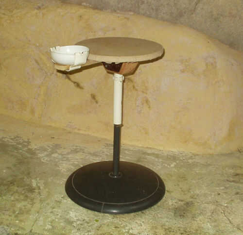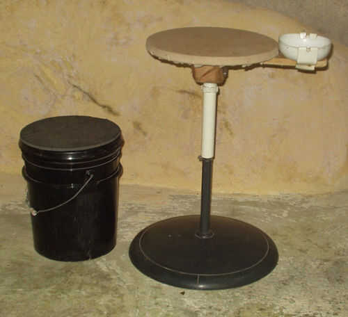 Todos los componentes son materiales reciclados. La base es un desecho fan base, 18" de diámetro. La plataforma de diámetro de 15" es una pieza redonda de madera de mi colección de madera de desecho.