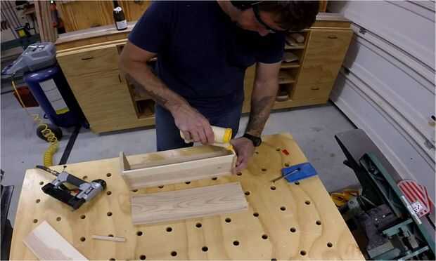 Finalmente es tiempo de construir una caja. Asegúrate de aplicar suficiente pegamento para madera a cada una de las articulaciones. Utilizar clavos del clavito para ayudar a sostener mientras el pegamento seca. Incluso con las uniones a tope la caja es un montón lo suficientemente fuerte debido a las uniones de pegamento de grano largo entre el fondo y los lados.