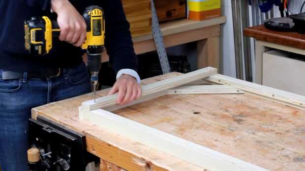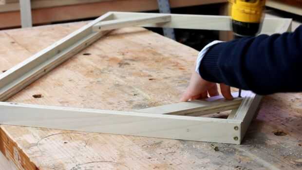 Siguiente taladre dos agujeros en la parte superior y de la corte c. alineen con dos patas en cada lado mirando hacia el interior y pre taladro en las piernas así para evitar rajaduras de la madera contrachapada. Sujételo con tornillos. Conecte el otro lado sobre la otra pata y repetir en la parte inferior para que tenga un marco completo. Luego hacer lo mismo otra vez, hasta que dos marcos separados.