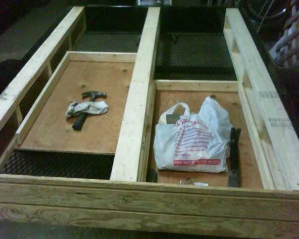 Ya que el suelo original del trailer es acero expandido (malla abierta) hice 2 bandejas deslizantes con madera contrachapada de 1/4 de pulgada y 1 x 2. Una vez que las puertas estén en su lugar estas bandejas permiten almacenamiento sin aerosol de camino de conseguir cosas húmedas.