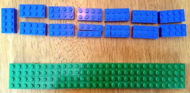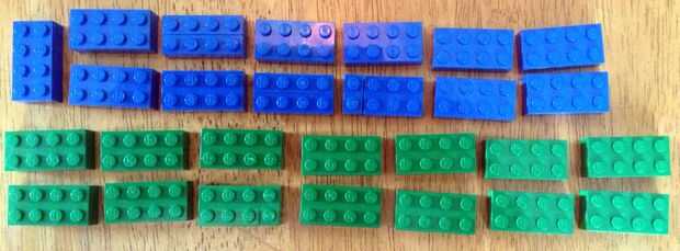 1. Colocar 2 filas de 14 ladrillos de 2 x 4 longitudinalmente (ver ladrillos verdes en fotos)