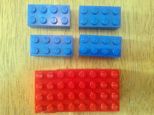 - Con 4 ladrillos de 2 x 4 crean un 4 x 8 base colocando 2 ladrillo horizontal con 2 ladrillos verticales actuando como delimitadores,