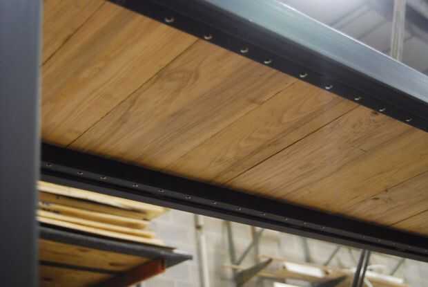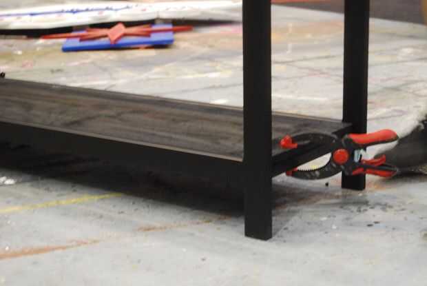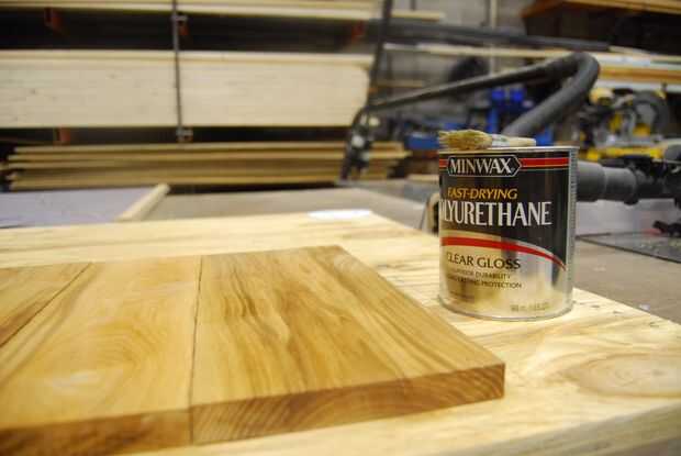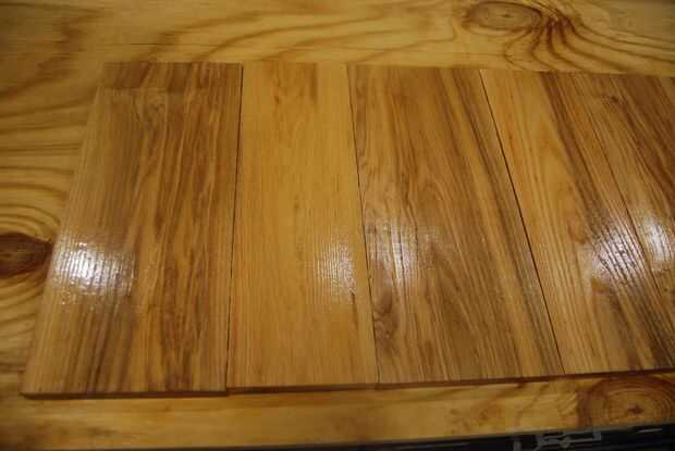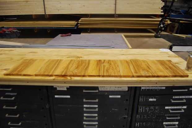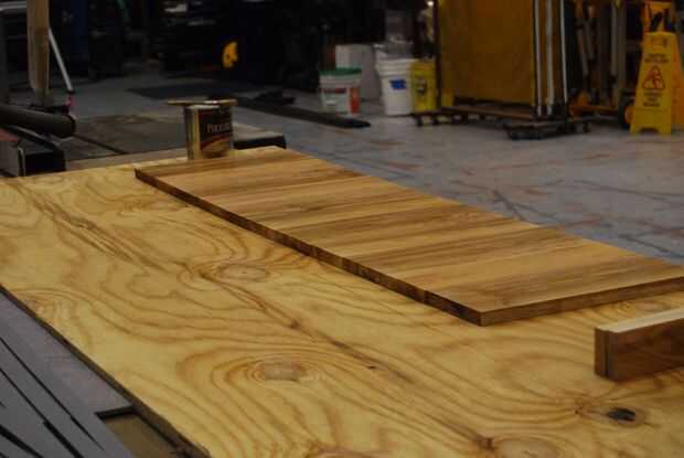 La ceniza fue planeada hacia abajo en dos caras 3/4" de espesor y los lados quedaron ásperos. Tuve dos tableros de diferentes espesores y cortarlos en tablones de 14". Decidí que un patrón alterno de ancho, tablero estrecho fue el más agradable y luego aplica dos capas de poly. Es importante cubrir estas planchas antes de instalar para que no acaben con gotas todo su stand recién pintada.