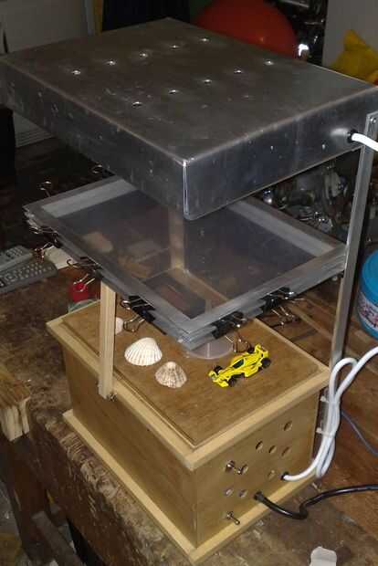 No entraré en cómo funciona la aspiradora formando, porque hay un montón de explicaciones en internet. Pero las preocupaciones son sostener la lámina de plástico, para calentarla, para mantenerlo en una mesa de moldeado hermético (platina) y para reducir la presión de aire para hacer la moldura. En Resumen, el calentador suaviza la lámina de plástico que se lleva a cabo en el marco. Entonces el marco se baja sobre el cristal de exposición, donde el objeto es. La bomba de vacío por debajo entonces dibuja hacia fuera el aire debajo de la sábana para que el plástico en la forma del objeto; se enfría y se hace el trabajo.