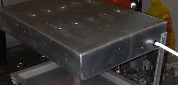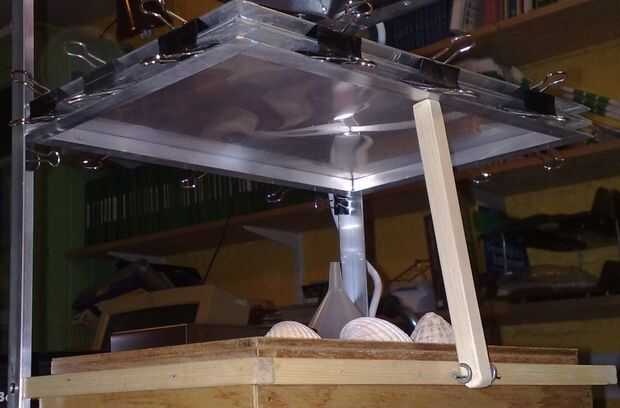 Une dos piezas de 500mm de ángulo de aluminio (20x20mm) a las esquinas traseras fuera de la caja principal. Estos actúan como guías para ayudar a alinear el marco cuando se coloca sobre el objeto. Usé un par de trozos de tarjeta para los espacio un poquito más amplia, para permitir que el marco de ampliar un poco. He encontrado que cuando se calienta el plástico en el horno de ensayos tempranos, el marco ampliado y no cabría dentro de las guías, no incluso cerca. Usar el calentador de la máquina, el marco no se caliente y ya no se trata de un problema. Usé una fijación temporal para el calentador (en caso de que estaba equivocado) un solo tornillo en la parte superior de cada extremo. Esto tiene el calentador como un voladizo pero es tan ligera que esto es suficiente. No sería suficiente si la máquina fue sacudida, como ser llevado en un coche. Para la calefacción, el marco es dependía de algunos clips conectados a los soportes y la parte delantera del bastidor se apoya sobre un puntal que se gira desde la parte delantera de la máquina. Cuando esté listo para el molde, el marco se levanta ligeramente para que el puntal se cae hacia adelante y fuera del camino. A continuación, el marco puede colocarse entre los soportes en la parte superior de la caja. He encontrado blanco calienta plástico de caderas con los soportes a 84mm de la caja del calentador, que pone el plástico a 89mm de los tubos del calentador.