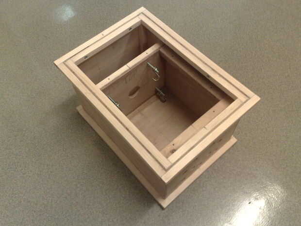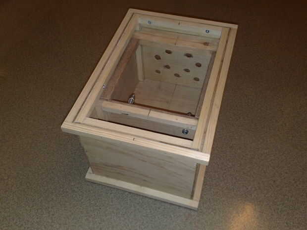 Uno de los extremos debe tener orificios para permitir que el aire hacia fuera y para los interruptores y cables. Los agujeros para estos necesidad de ser hecho antes de se sujeta. Madera contrachapada puede ser realmente difícil perforar cuidadosamente. He usado brocas planas de alta velocidad (con resultados mixtos), pero brocas Forstner o pedacitos de madera envejecidos antiguo están mejores.