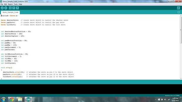 int tiltNeutralPosition = 90; int tiltIncrement = 5; int tiltMin = 60; int tiltMax = 120; int tiltCurrent; void setup() {shutterServo.attach(9); / / conecta el servo en el pin 9 para el servo objeto panServo.attach(10); / / conecta el servo en el pin 10 a la tiltServo.attach(11) de objeto servo; / / conecta el servo en el pin 11 al objeto servo} void loop() {shutterServo.write(shutterNeutralPosition); panServo.write(panNeutralPosition); tiltServo.write(tiltNeutralPosition);