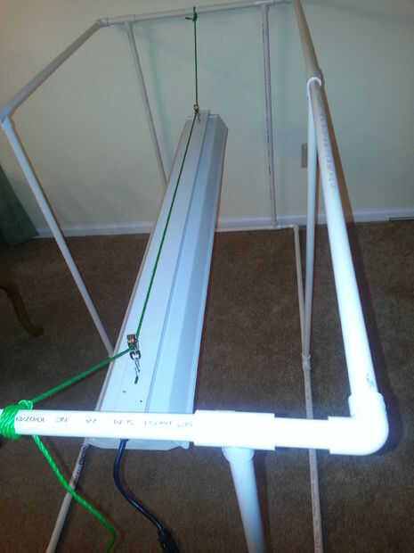 Tire el extremo abierto de la cuerda sobre el borde del tubo. Como tensar la cuerda, verás la luz deslizándose por la cuerda y nivelación sí mismo naturalmente. Lazo de un rápido nudo y usted puede ver cómo fácilmente y rápidamente puede ajustar las luces para sus configuraciones de hidroponía.