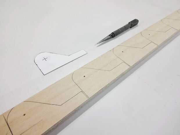 La parte superior de las piernas, así como las piezas de la bisagra en forma de P fueron cuidadosamente perforada con un clavo a través de la + marcas en las piezas del patrón. Estas marcas indican la ubicación de los agujeros que luego se hacen usando una prensa del taladro. Estos agujeros necesitan ser precisamente situado y perforados en exactamente 90 grados. (No se recomienda el hacer estos con la mano.)