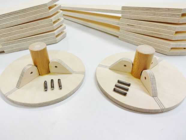 Las piernas se unen a las plataformas con los pedazos de varilla de 3/16" de metal que funcionan como clavijas de la bisagra.