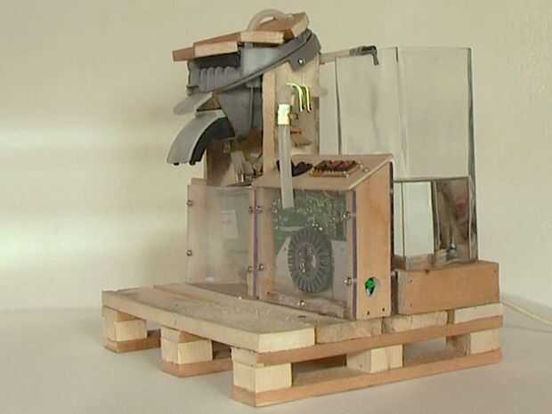 Muestro una cafetera adentro hacia fuera, en una mini plataforma. Una forma de 'rediseño de la máquina de guerrilla'. Vivir en un mundo de cajas negras, es una provocación para mostrar las "partes internas". Penetración en los procesos de dar mayor comprensión si algo sale mal. 'Cuando usted no lo abre usted no la posee'. ¿Cómo muchos cafeteras rotas nunca se han abierto para una breve inspección dentro de la vivienda? Me sorprende, como taller de reparación, qué tan rápido que el problema se encuentra después de abrir el 'tesoro'.