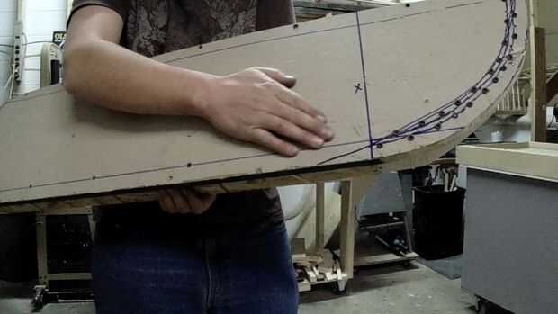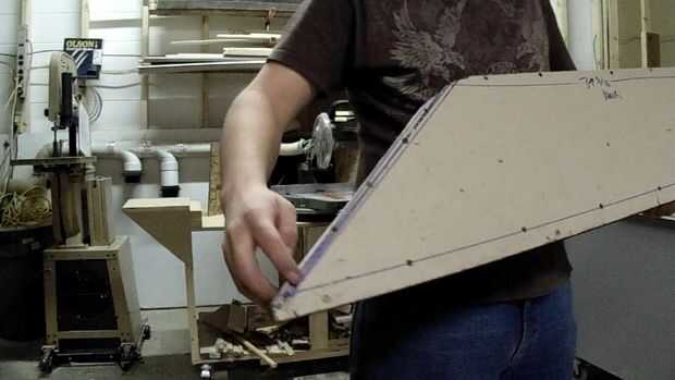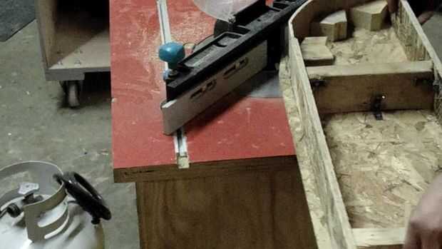El siguiente paso que tomé es una serie de cortes de acabado a las piezas de la forma que necesitaban para estar en la forma. En este paso me fui a la sierra. Yo había dispuesto el arco de la cara redonda y el lado angulado y cortarlas. Me pareció útil para atornillar piezas de la caja en la esquina trasera en el lado del ángulo. Esto es porque necesitaba un radio pequeño en la esquina trasera debido a cómo la alfombra había redondeada la esquina interna del ángulo de plataformas. Cuando atornilladas corté todos tres pedazos de madera que se cruzan en esa esquina a la vez en ese radio. En la sierra también hice una serie de cortes de alivio en ese pedazo de madera contrachapada de 1/4", luego remojo, por lo que puede estar doblado en una forma redondeada. También corté pedazos de madera para apoyar la madera redondeada por detrás.