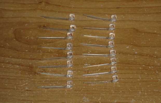 Después de moler la curva todos los cables de 90 grados en la base de los LEDs. Doblar todos los alambres de que la misma manera - polaridad importante en LEDs. Esto permitirá que todos los LEDs al ser soldadas juntas en una cadena.
