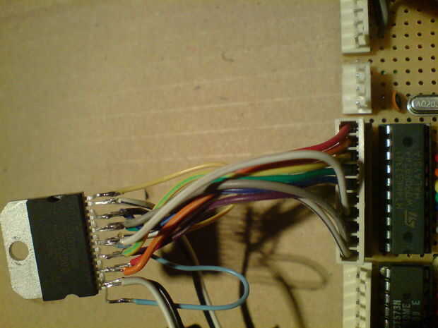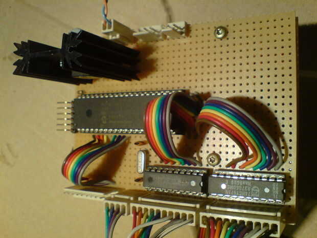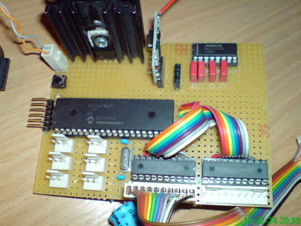 El corazón de este robot es un microcontrolador de 8 bits del PIC16F887. El secreto no está en el hardware, es en el código. Me di cuenta de las funciones muy básicas con el microcontrolador como medición de entradas analógicas de los sensores (intensidad de luz, temperatura, infra la medición de distancia), entradas digitales (sensores digitales, contactos), digital salidas motor de conducción un puente H con dos DC (conexión de piezas alta actuales como la cámara o power LED) y proporcionan la señal PWM para controlar velocidad del motor, control de motor servo (cabeza, brazos). Estas son funciones muy básicas y necesitan muy poca codificación usando lenguaje C.