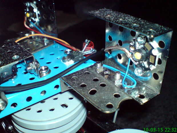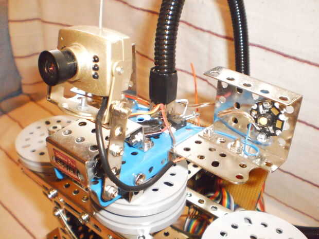La cabeza tiene margen de giro/inclinación de 180/180 grados. Se ve muy divertido :) Tiene una potencia LED en cada lado que puede activarse/desactivarse remotamente y que pueden dar suficiente luz para ver en un cuarto totalmente oscuro. No he probado pero infra LED se puede utilizar para el modo sigilo porque los ojos humanos no pueden ve la cámara infrarrojo luz.