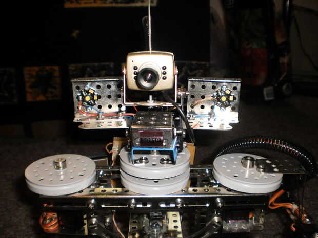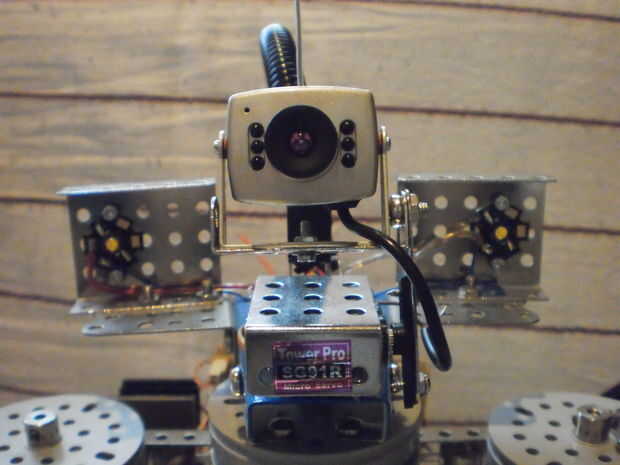 La cámara es una cámara de seguridad inalámbrica que se puede conectar a cualquier TV. Se puede transmitir imagen en resolución media con sonido así. Es simple, confiable y puede activarse de forma remota para ahorrar tiempo de batería. Conecté la imagen directo a mi PC a través de un digitalizador USB por lo que pude ver lo que el robot está mirando como una webcam. En el lado de la PC puedo manipular la imagen entrante y hacer algunas cosas con ella como reconocimiento de borde, color u objeto.