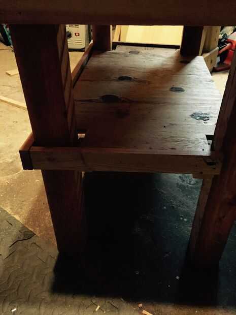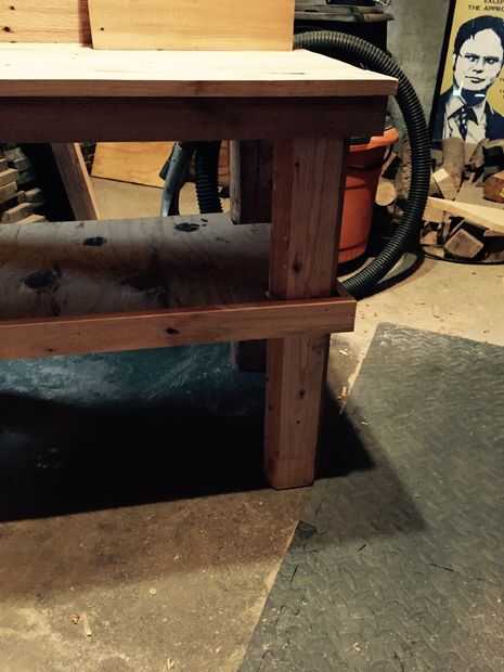 Sólo corté un trozo de madera contrachapada de las mismas dimensiones que la parte superior, 15 x 29. Luego corté las esquinas por lo que encajaría alrededor de las piernas. Usé algunos desechos de madera y atornillado en el interior de las piernas para levantar la capa. Entonces para que se vea bonito y añadir algo de fuerza le puse un recorte alrededor del pedazo con la clavadora.