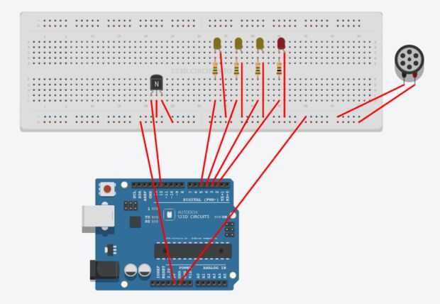 En cuanto a los LEDs, estoy usando pin 2 a 5. A partir de 2 Pin, donde se conecta mi LED blanco, 100 Ohm resistor está conectado a él en serie con el ánodo del LED y el cátodo está conectado a la tierra. Para los otros LEDs, está utilizando la conexión del patrón, pero se utilizan resistencias de 150 Ohm donde hay conectado al pin 3 a 5 en serie con el LED amarillo.