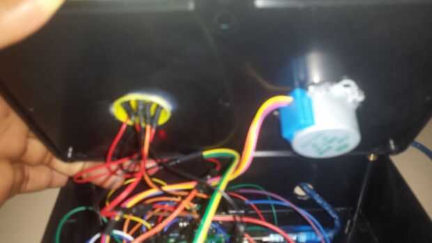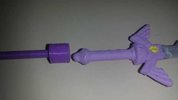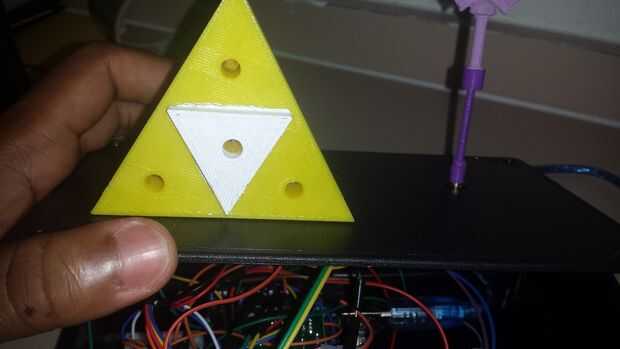 Después de la pintura el medio triángulo con pintura acrílica blanca y la espada de color morado, los LEDs fueron montados dentro de los agujeros en la parte delantera de la Trifuerza. Epílogos, fue traído detrás para crear el recinto. el apoyo fue conectado fácilmente con la espada con la otra conexión del motor paso a paso. El motor paso a paso se sujete usando pegamento caliente con un agujero perforado encima de la caja para la ayuda. la Trifuerza fue conectada a la parte superior de la caja donde una 1 pulgada entero como hicieron para apoyarla.