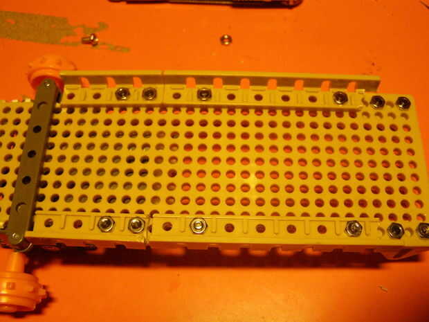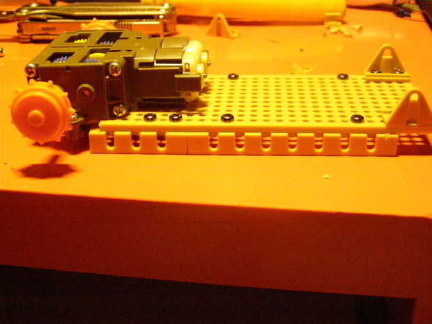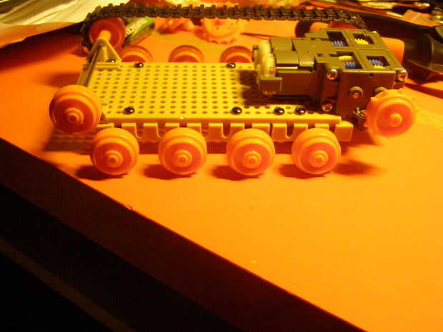 Luego inserta cuatro varillas en la brida de ángulo recto. Luego instale tres de las ruedas más grandes. Repita para la rueda ociosa, que usan la misma rueda de tamaño como las ruedas de carretera. El piñón es entonces en el eje de salida del motor.
