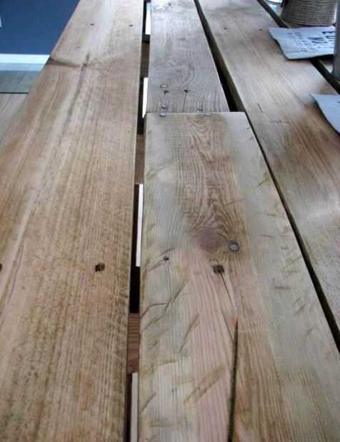 Había grandes huecos entre los tablones de madera en mi plataforma, así que había que llenarlos de la parte superior con los extras para evitar que se caiga todo al suelo. No he tenido los tablones largos, usé dos más cortos de la plataforma más pequeña. I cortar en el tamaño correcto y entonces clavó a las lagunas. No coinciden exactamente como se puede ver, pero creo que así parece más interesante.