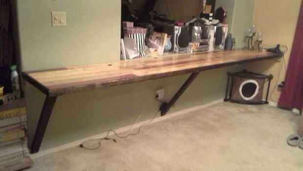 Coloque el escritorio a los soportes de fijación. Utilicé tornillos de madera 2 5/8 para ello. Manejé los tornillos de la parte inferior a través de la 2 x 4" y en el escritorio de esta manera no se puede ver la cabeza del tornillo en el escritorio.