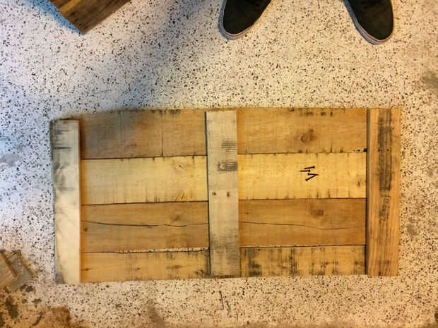 Ahora tenemos que estabilizar nuestras piezas por conectarlos con piezas de madera en su parte trasera. Corté un pedazo extra de plataforma madera en tercios que miden la misma longitud que las cuatro piezas de madera que están actuando como mi lienzo.