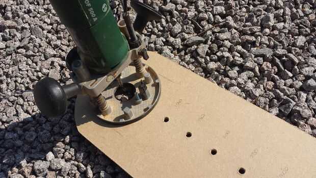 A lo largo del centro que he perforado agujeros cada 50mm con el primero es 100mm desde el centro de la broca de fresadora (esto es porque era de 50mm a cerca de la placa base del router) los agujeros que he perforado son 6mm pero eso es sólo porque tenía un tornillo de repuesto 6mm que iba a utilizar como la patilla central. Lo que yo diría es asegurarse de que no taladre los agujeros más grandes que lo que se decide utilizar para la patilla central como la más estricta el ajuste más