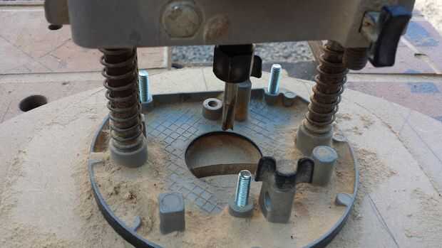 La fijación del router se hicieron primero, mi router es un básico hogar bricolaje Bosch modelo que permite el tornillo en la base. En el MDF sólo había trazada alrededor de la placa base del router, perfore el orificio en el centro de la broca de fresadora y marcados los agujeros para los tornillos de 3. Los orificios de tornillo en la parte inferior del MDF se avellanados para que todo funcionó suavemente cuando se gira.
