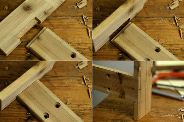 Estas juntas fueron cortadas con un cincel. No sé lo que se denominan (mitad-traslapado T, tal vez) pero trabajaron bien con la madera. Muy bien había equipado y llevó a cabo la firma de patas traseras sin pegamento.