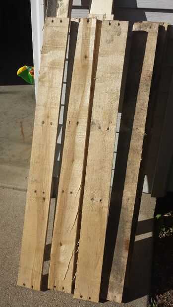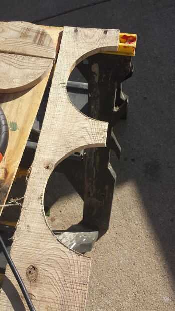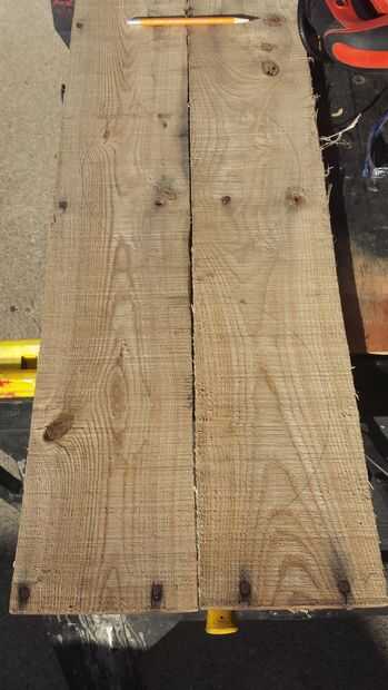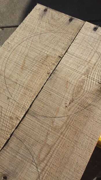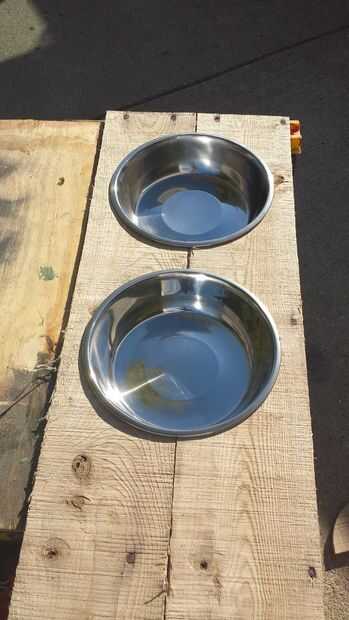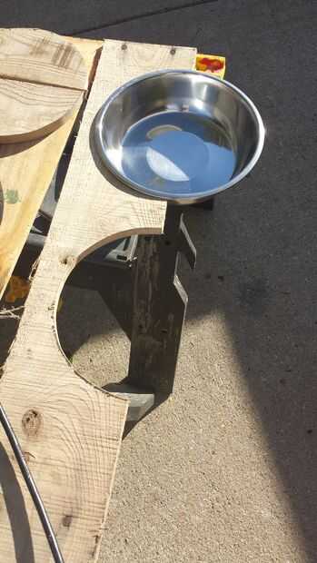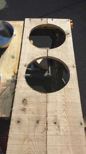 Después de decidir sobre las dimensiones apropiadas (teniendo en cuenta la altura del perro) corté las tablas de palet con una sierra para cortar ingletes (una sierra circular también habría trabajado). Luego trazó los tazones de fuente en las tablas y hacer un círculo más pequeño dentro que compensa el labio alrededor de los tazones de fuente, lo que les permite descansar dentro. A continuación corte los cuatro semicírculos de los tableros con jigsaw y ajuste el perro metal cuencos dentro.