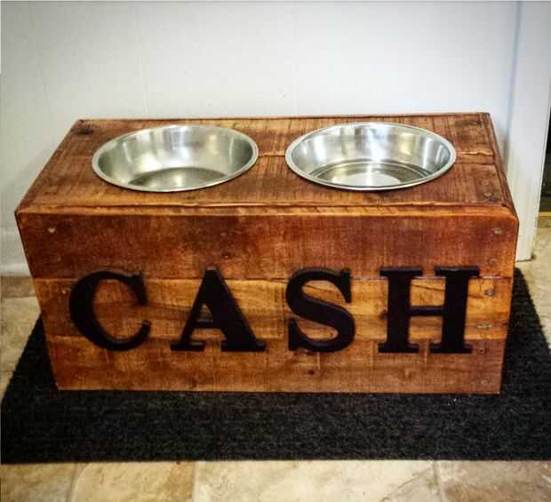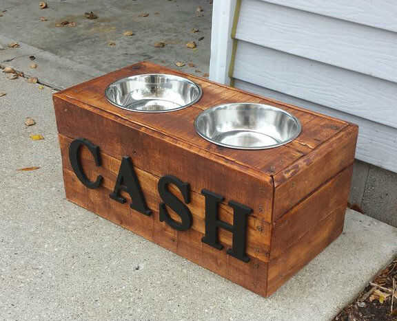 Después de lijar el soporte apliqué un tinte castaño medio. He comprado unas letras de madera de una tienda de artesanía y había pintado negro antes de pegarlas les en la parte delantera de la caja con pegamento. Finalmente cubre el soporte en unas pocas capas de poliuretano para que sea más resistente al agua y había colocado dentro de los tazones de fuente.