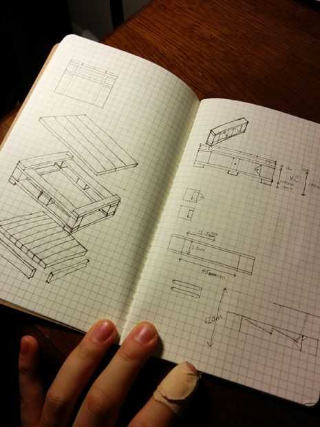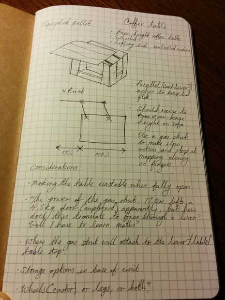 Después de medir las diferentes partes que terminó, escrito mi inventario en una Moleskine para tratar de elaborar lo que sería/podría ir donde. Tuve cuatro tablones medio decente en 1200mm y alrededor de 150mm de ancho. Con eso cuatro tablones como una parte superior/tapa que, combinados, tienen un ancho de 600mm (y decidir su altura basado en nuestros asientos de piernas/sofá) tenía las dimensiones de mi mesa: largo 800mm, 600mm de ancho y 450mm de alto, con la tapa de tabla para levantar a un útil 600mm alto en posición elevada.