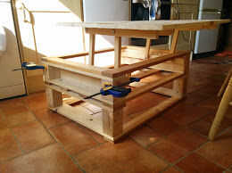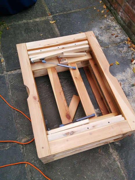El listón de 'frontal', en la posición vertical, debe aprender un poco delante del centro y el resto en el borde de la mesa de estabilidad ya que es menos probable que consigue golpeado hacia atrás en su posición bajada. Separación de los listones de esta manera encontré que el mejor compromiso de robustez y máxima altura de la mesa.