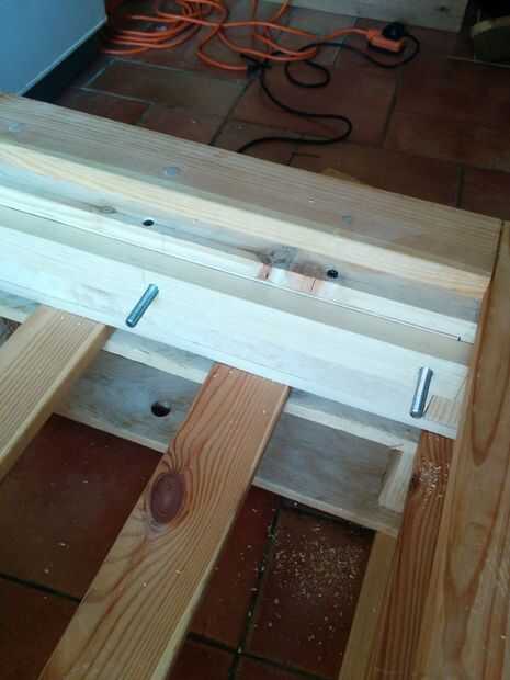 Los extremos superiores de los brazos entonces se atornillan a dos listones paralelos a los inferiores en la parte inferior de la tapa de tabla. El espacio entre los orificios de los listones superiores e inferiores debe ser igual - en el caso de mi mesa, ~ 230 mm aparte - por lo que los brazos permanecen paralelos uno al otro independientemente de la posición. No hace falta decirlo, esto asegura que los restos de la mesa paralelos al piso levantado, bajado, o en cualquier lugar entre.