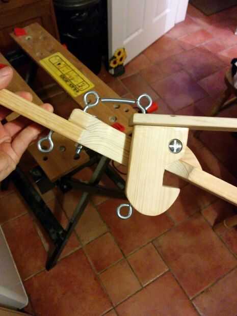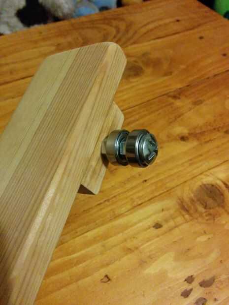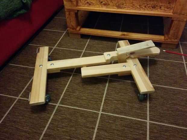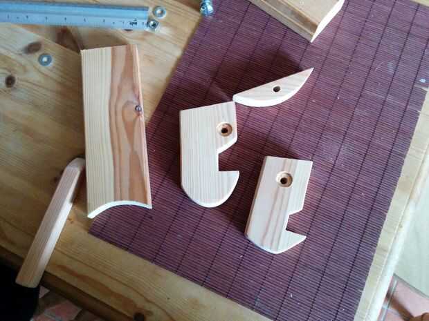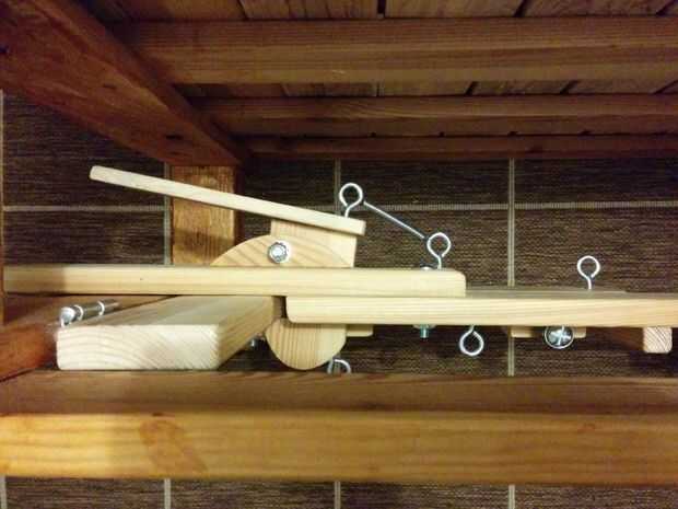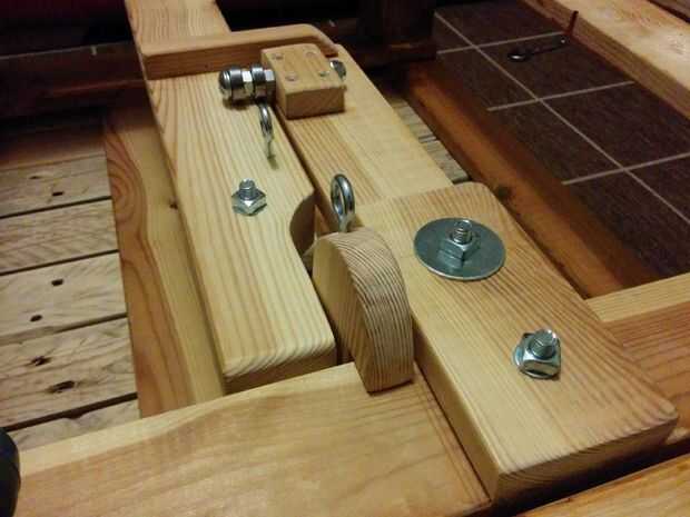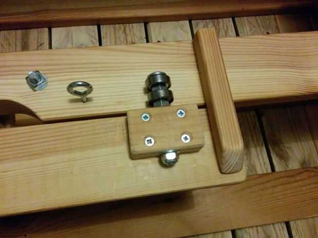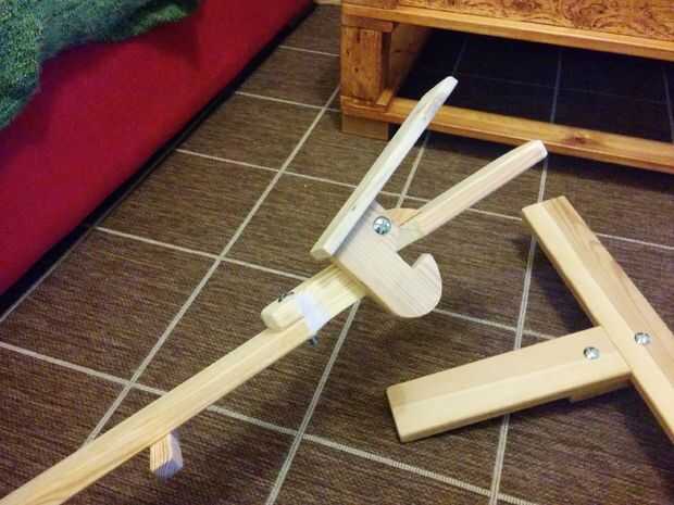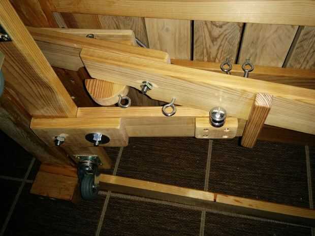 Este sistema fue hecho usando alguno de los listones de la cama y los pernos restantes. La palanca más larga (con el pedal) se compone de dos tramos de madera con una superposición de la otra para formar el pedal. I completa el pedal con la sierra caladora y le dio un cuidadoso lijado para hacerla más pie desnudo/calcetín acogedor.