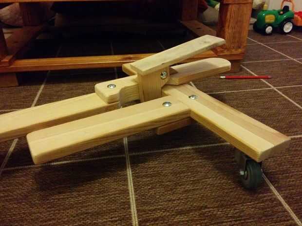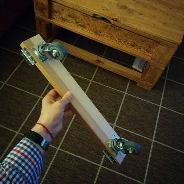 El tren de aterrizaje consta de dos longitudes de 450mm de madera con dos ruedas giratorias en sus extremos que se abisagran en el interior borde de la mesa. Cuando estas barras de rueda son horizontales (el punto más bajo de las bisagras permiten) las ruedas estén en contacto (pisando un pedal) y levante la tabla apagada ligeramente sus pies lo que le permite mover las ruedas. Un segundo pedal, situado por encima y hacia adentro del primer pedal libera el mecanismo y baja la tabla, vuelva a sus pies.