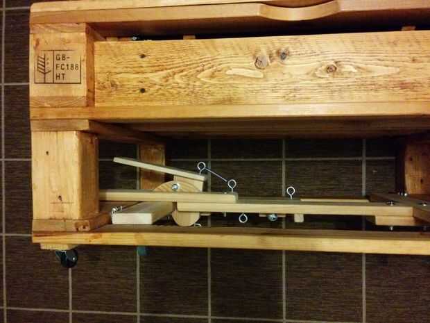 Cuando en la posición (horizontal) más baja que las ruedas se dedican y los pies levantados, un gancho de madera con resorte sostiene el pedal más a la barra de la rueda en el lado opuesto lo que significa que no es necesario mantener una presión constante en la palanca de la fuerza de las ruedas hacia abajo. El segundo pedal libera el gancho y el peso de la mesa empuja las ruedas de ricino hasta que los pies de la mesa están firmemente en el suelo. He añadido algunos resortes más contratación a la parte superior de la palanca más corta para asegurarse de que las ruedas son forzadas hacia arriba y el suelo tanto como sea posibles.