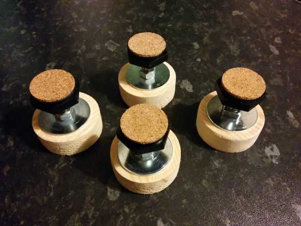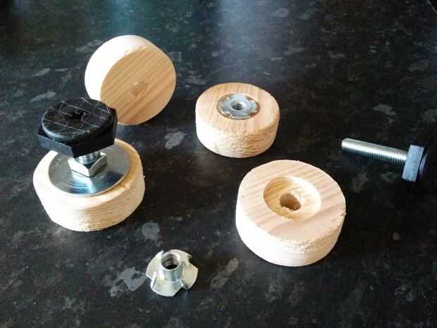 Las tuercas se rosca sobre los pies, seguidos por una arandela de ala ancha (?) antes de insertar los discos de madera y finalmente el T-nut en el otro lado. Apretar la tuerca tiró los dientes de la tuerca de T en la madera, tirando al ras con el borde de la hendidura en que se sentó. Después de hacer que los pies eran una altura incluso con mi regla, almohadillas de corcho autoadhesivo fueron atadas a la parte inferior (la superficie de los cuales había ya marqué con un cuchillo Stanley) y tabla levantada y vuelta vertical.