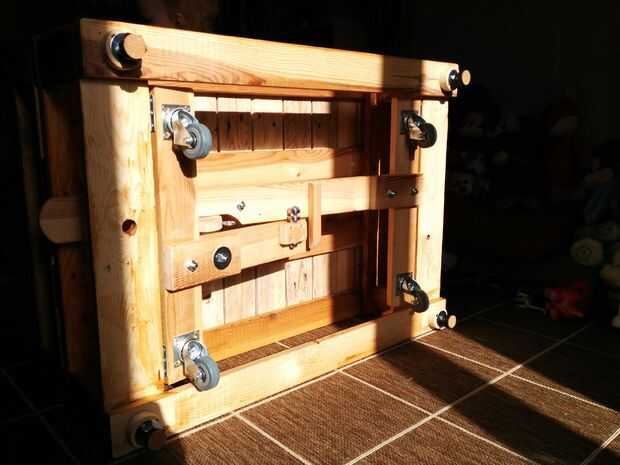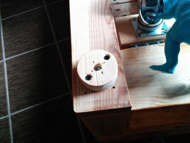 Dos agujeros fueron perforados a través de cada disco - cada lado del agujero central - y en la base de la tabla. Tuercas en T fueron empujadas en cada una de las ranuras en las tapas de los discos antes de ser pegados y atornillados a la mesa.