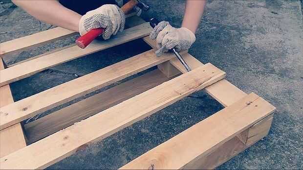 Así que saque la segunda plataforma con ayuda de martillo y cincel listones y quite todos los clavos oxidados. O también se puede utilizar una sierra de hierro, pero en este caso, las uñas permanecen en la madera. Coloque los listones escogidos con clavos entre los listones de la parte superior.