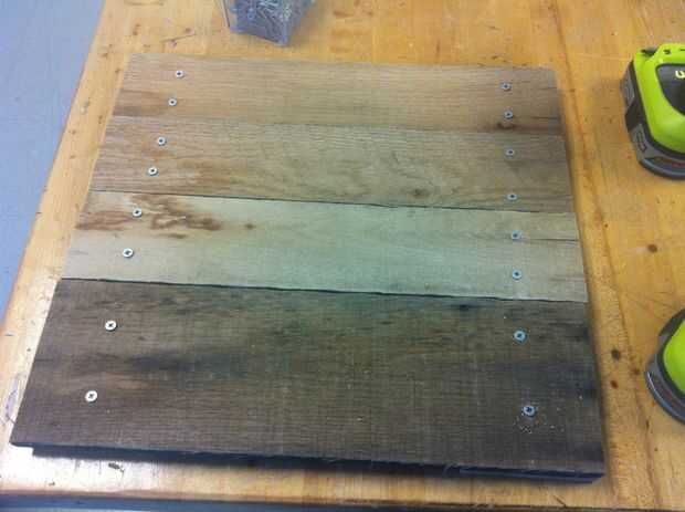 Cortar tablas con el tamaño que desee y atorníllelos con piezas más largas por debajo para crear la base de su silla. Luego cortar dos piezas largas y atorníllelos con trozos más cortos de madera. para hacer el resto superior. Hacer lo mismo con más piezas para el principal detrás de la silla.