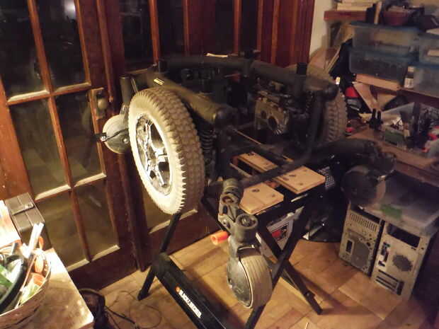 Tuve suerte de conseguir una silla de ruedas eléctrica utilizado a un costo razonable. Quité el asiento y todas las piezas no esenciales para su uso posterior.