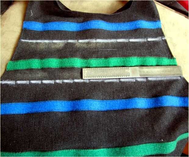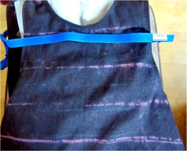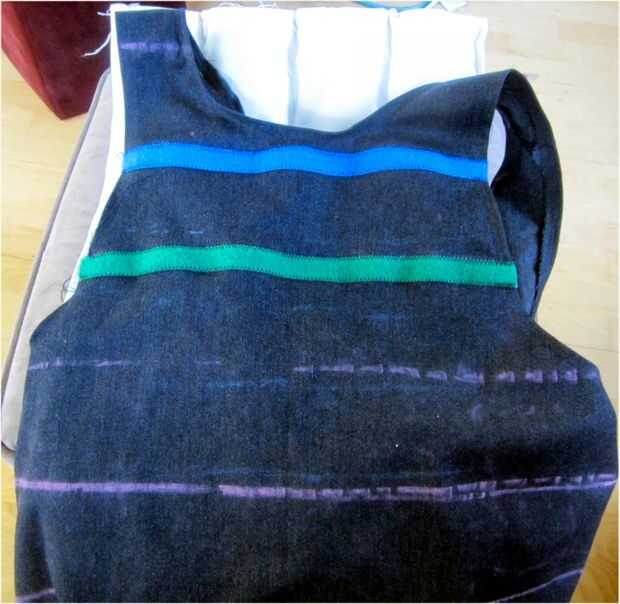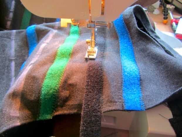 Por razones económicas, sólo voy parcialmente ronda Este delantal como velcro es caro. Prácticamente no es necesario recorrer camino en la espalda tampoco. Por esa razón, pudo haber sido mejor elegir un color más tenue para el velcro, como negro. Pero no pude resistir la deportividad alternancia de franjas horizontales de color.