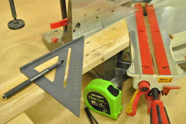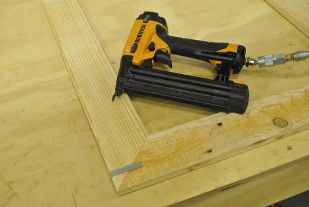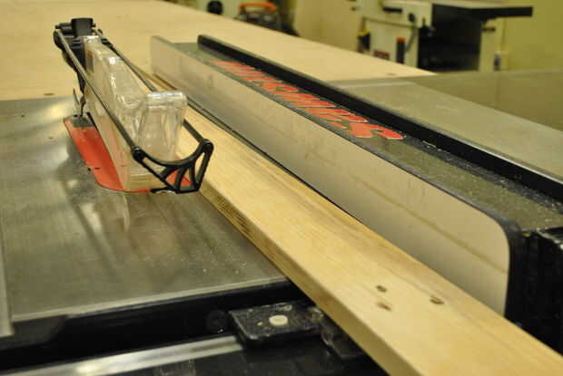 Esa advertencia en mente, corrí la madera a través de la tabla VI y solo quita ~1/16 "de cualquier lado para garantizar que el mismo ancho. La sierra me metió la 45o las esquinas, luego la pistola de clavos neumática y por último lijar para acabar las cosas.