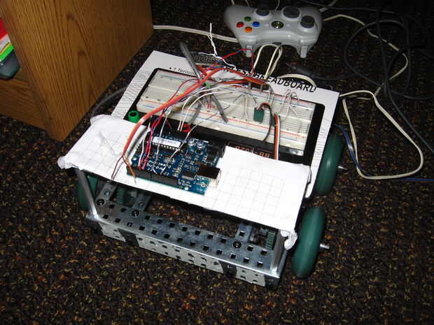 En la PC necesitamos abrir el puerto serial y enviar cuadros de datos que comprenderá el programa de Arduino. La PC también tiene que llegar a valores de motor. Una manera fácil de hacerlo es utilizar un joystick o un gamepad USB, estoy usando un controlador de Xbox 360. Otra opción es usar una computadora en red (un netbook o un mini pequeño tablero ITX) en el robot en sí mismo para conducir de forma inalámbrica. Con un netbook, usted puede incluso utilizar la webcam a bordo corriente detrás una alimentación video y tu robot remotamente. Usé el sistema de sockets de Linux para red de programación de mi configuración. Un programa (el "servidor de joystick") se ejecuta en un PC aparte que tiene un controlador conectado a él, y otro programa (el "cliente") se ejecuta en el netbook conectado a Arduino. Esto conecta las dos computadoras y envía información del joystick a la netbook, que luego envía paquetes serial al Arduino que impulsa el robot.