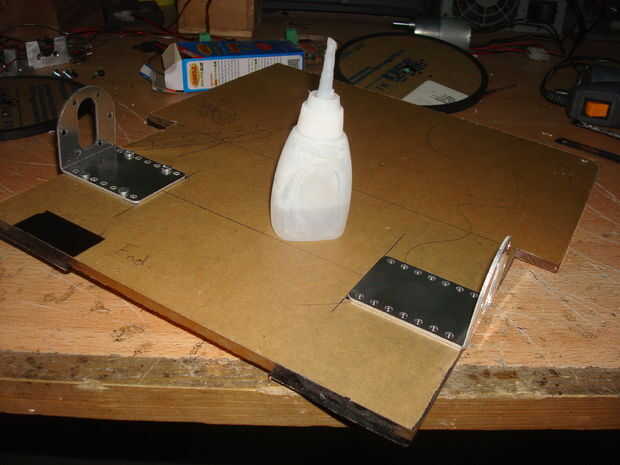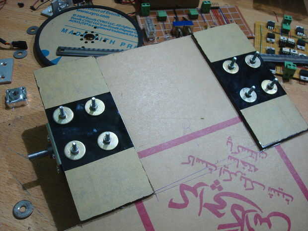 Para los motores primero tenemos que instalar los soportes del motor. He centrado en los montes y marcados los límites. Luego retirar la hoja protectora de la parte y pegados los soportes usando pegamento caliente. Luego los orificios perforados y sujeta los soportes con tornillos y tuercas. Luego había montado los motores.