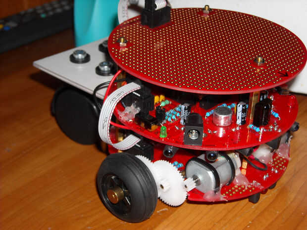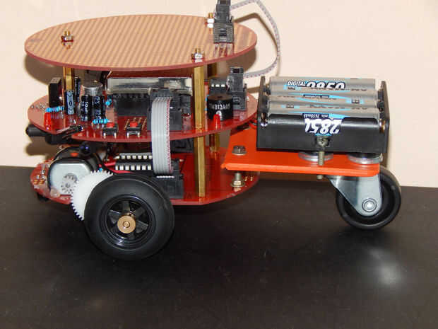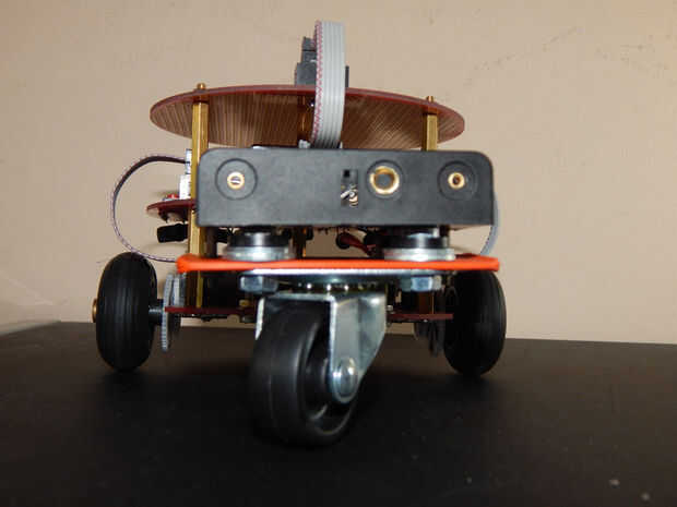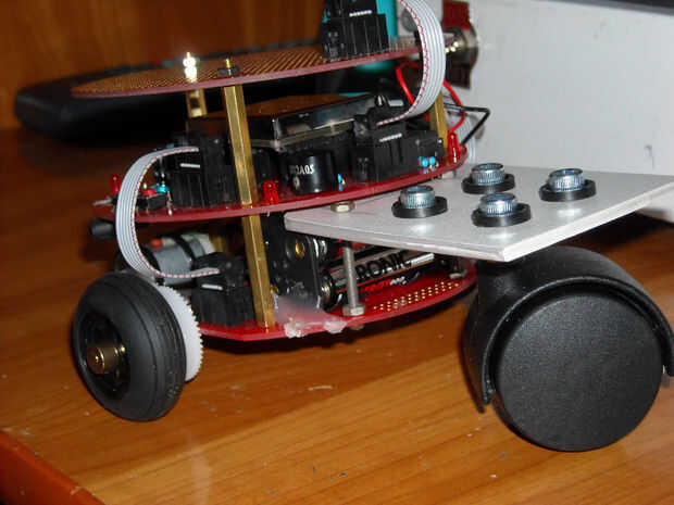 Las pelotas de ping pong eran más lentos el robot, debido a la alta fricción con cualquier superficie que encontró. Fueron reduciendo la distancia al suelo. Usé una rueda de la silla de oficina y un pedazo de cartulina gruesa para mi primera prueba. La rueda de la silla de oficina era demasiado grande, causando problemas de dirección, al ir hacia atrás. Pero la idea era buena, aunque.